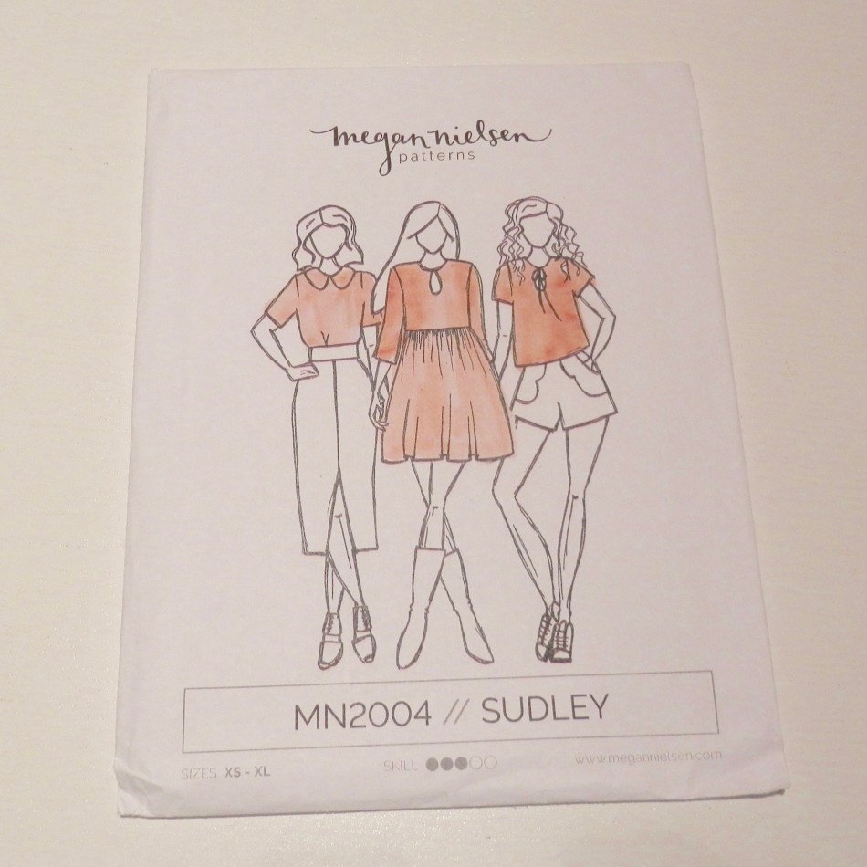 Sudley-pusero/mekko on ensimmäinen kokeilemani Megan Nielsen -kaava. Sudley on nerokkuudessaan yksinkertainen. Kyseessä on kääntövaate. Eikä se tässä tapauksessa tarkoita sisä- ja ulkopuolen käännettävyyttä, vaan etu- ja takapuolen käännettävyyttä. Puserossa ei siis ole selkää etuosaa ja takaosaa vaan sitä voi käyttää kummin päin tahansa. Tämän lisäksi kaavassa on vaihtoehdot lyhyelle ja pitkälle puserolle sekä mekolle. Monipuolisuuden puutteesta kaavaa ei siis voi syyttää.