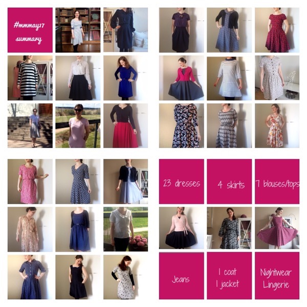 Toukokuu kului nopeasti. Kahta työmatkapäivää lukuunottamatta laitoin Instagramiin joka päivä kuvan päivän #mmmay17 -asustani. Kuukauden lähestyessä loppuaan tajusin pukeutuneeni joka päivä eri asuun. Työmatkalla käytin kahta jo aikaisemmin kuussa käyttämääni vaatteita, ja tummansininen tulppaanihameeni pääsi päälle kahteen kertaan. Mutta oikeastaan omaksi yllätyksekseni huomasin, että voisin halutessani käyttää kuukauden ajan joka päivä eri asua ja pukeutua silti hyvin pitkälti itse tehtyihin vaatteisiin.