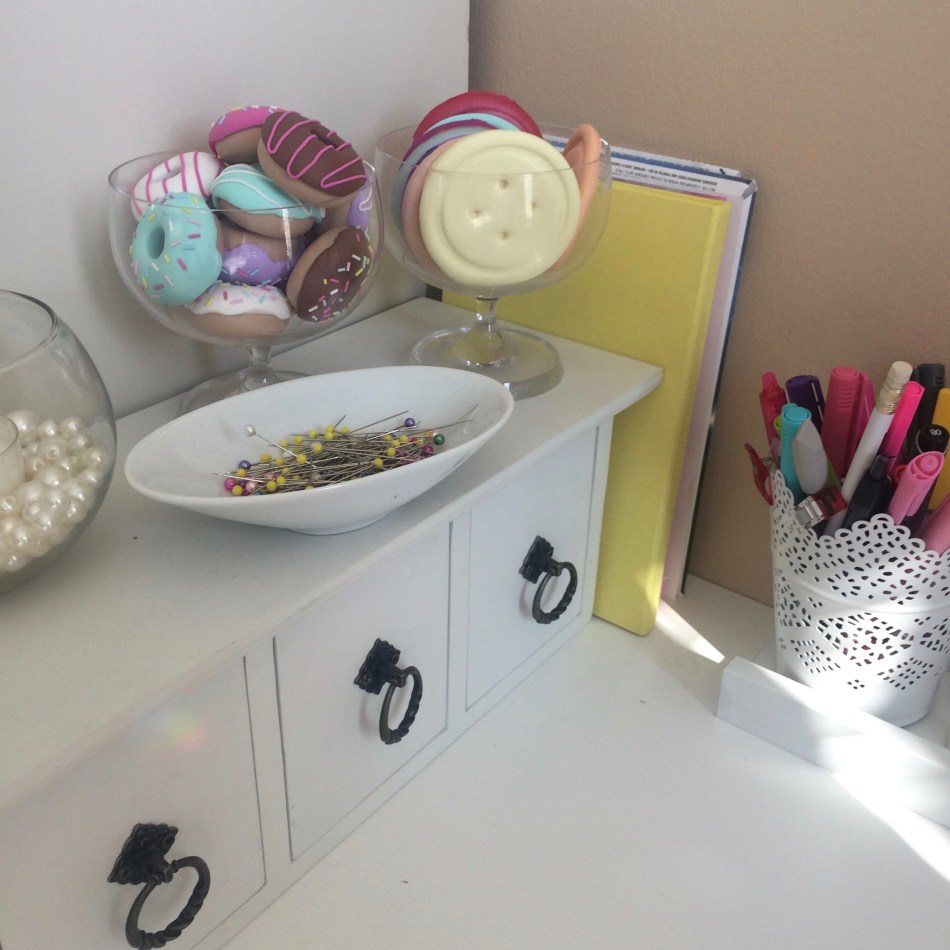 Monet ompelutarvikkeet ovat nykyään hauskan värisiä ja jopa hauskan näköisiä. Kaavapainoja ainakin löytyy jos jonkinlaisia. Nekin voi asetella kauniisti esille, jolloin ne toimivat ompeluprojektien välissä kivana sisustuselementtinä. On sitä turhempiakin koriste-esineitä. Tai entä värikkäät nuppineulat ja lankakerät? Parhaita säilytysratkaisuja ovatkin ne, joissa käytännöllisyys ja esteettisyys yhdistyvät.