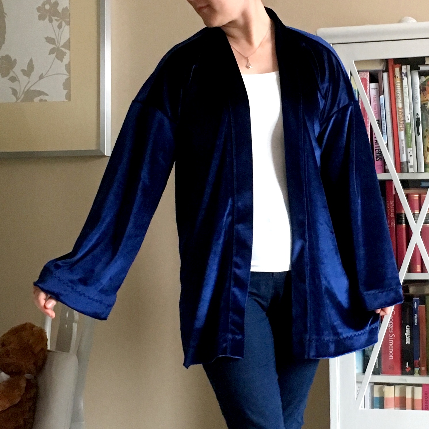 Syksyn ompelusuunnitelmiini sisältyi lämmin kimono. Ajatuksenani oli ommella kotiasuksi kimono, joka sopii käytettäväksi mekkojen tai minkä tahansa muun vapaa-ajan asun päällä. Valitsin kaavaksi Sew Over It:n kimonojakun kaavan, jolla olen ommellut pari kimonoa jo aikaisemminkin. Päädyin kuitenkin pidentämään hihoja ja muokkaamaan helman pituuden kahden kaavan tarjoaman pituuden välimaastoon. Kankaan tähän kimonoon löysin itse asiassa jo kesällä, joten se odotti valmiina vuoroaan kangaskorissa. Tämä tummansininen sametti olikin täydellinen valinta tähän ompelukseen. Kangas joustaa hieman, mutta pitää kuitenkin ryhdikkäästi muotonsa. Siinä on kaunis kiilto. Uusi talvikimononi onkin ollut käytössä jo monta kertaa.