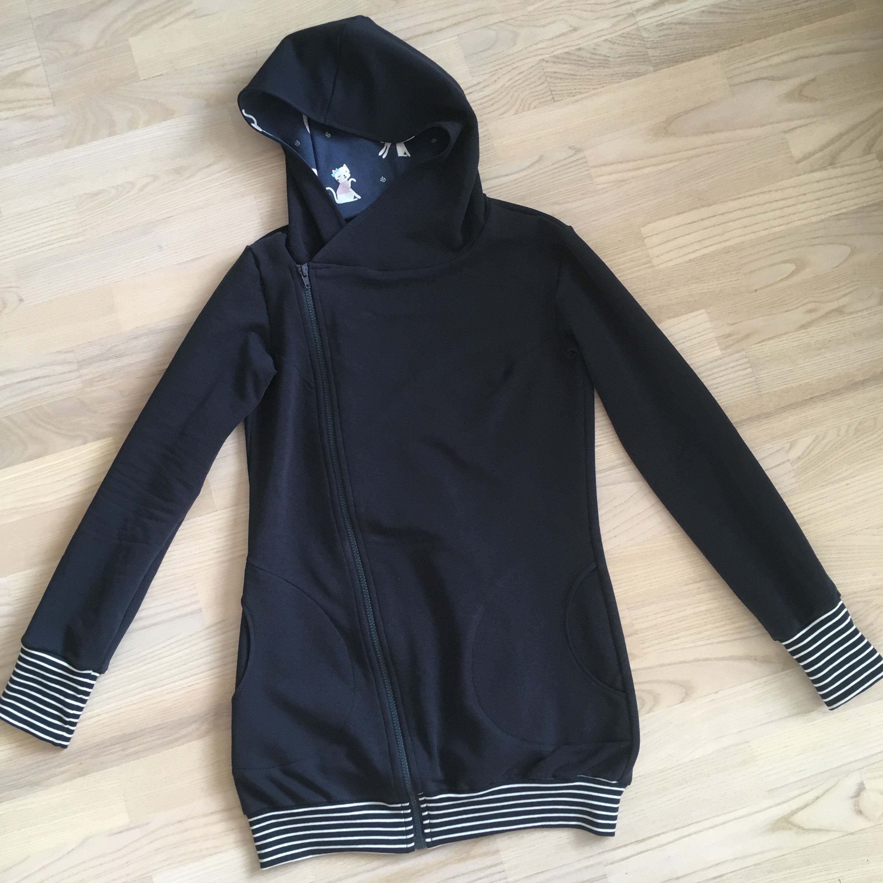 To continue my warm casual clothes sewing series, I made my self a new hoodie. This was another project that was included in my autumn sewing plans list. I chose a women’s hoodie pattern by the Finnish company Jujuna for this project. I wanted to sew this hoodie using very basic navy French terry. I had still some of this prettiest stripe ribbing in my fabric stash. And this was also the perfect project to use some of the cute cat jersey I have had already for some time. This was one of the most rewarding sewing projects of the autumn. I was a little bit worried to sew the diagonal zipper and these fun pockets. But I think this project made me once again realize that there isn’t actually much I could not sew when I just go for it. Have you already read my previous post about this hoodie?