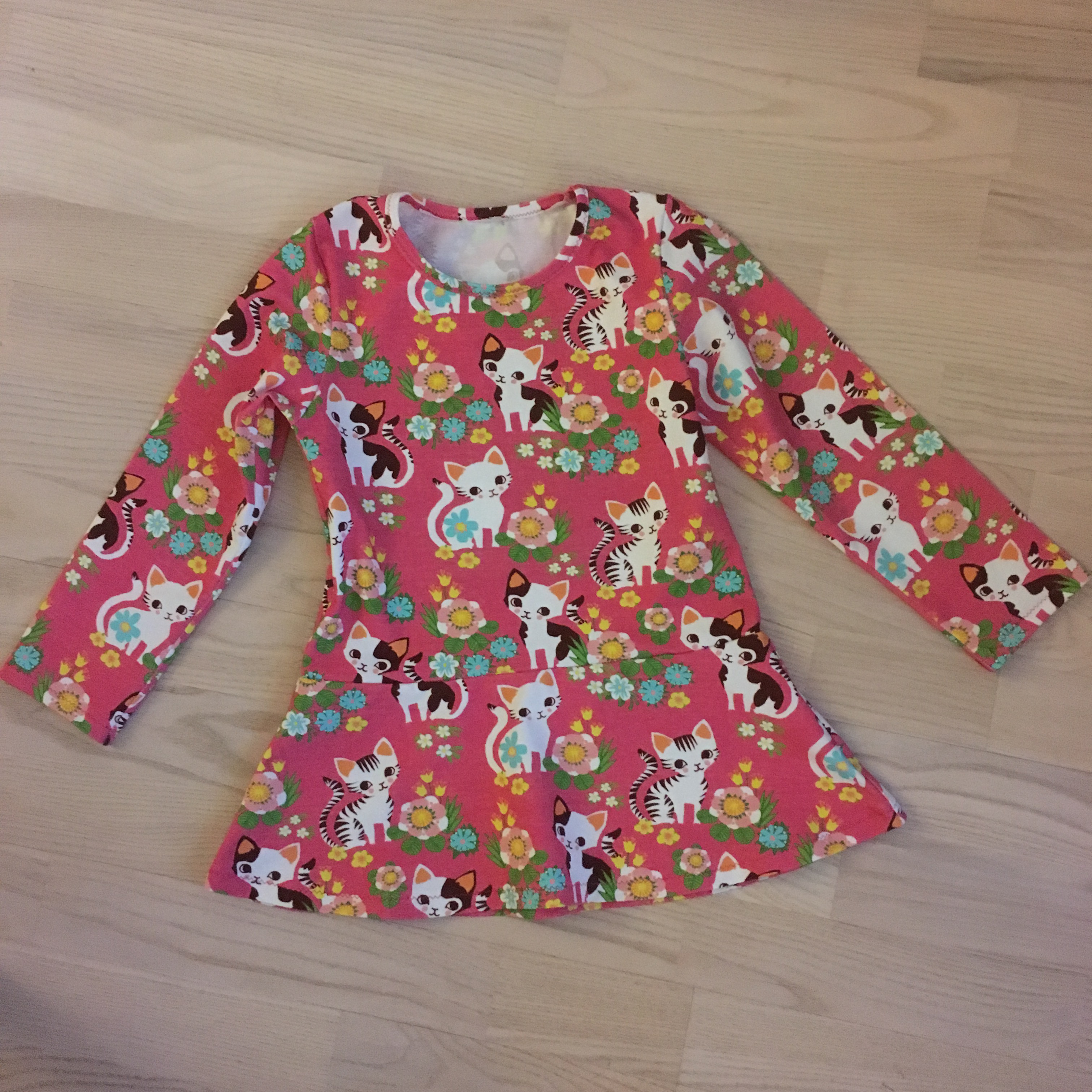 Ompelin hänelle vuosi sitten peplumpaidan suloisesta kissatrikoosta. Kyseinen paita jäi tänä syksynä auttamattomasti liian pieneksi, joten otin ompelulistalleni uuden kissapaidan. Käytin tähän samaa Jujunan lasten paitakaavaa, jota olen käyttänyt ennenkin. Kaava kun on yksinkertainen, mutta helposti muunneltavissa. Siinä on lisäksi hyvin eri kokoja. Koska ompelen lapsille melko harvoin, koen lastenvaatteet aina jollain tapaa hankalammiksi ommella. Erityisesti pienten päänteiden viimeistely aiheuttaa välillä päänvaivaa. Kissapaita onnistui kuitenkin hyvin ja oli kovin mieleinen lahja.