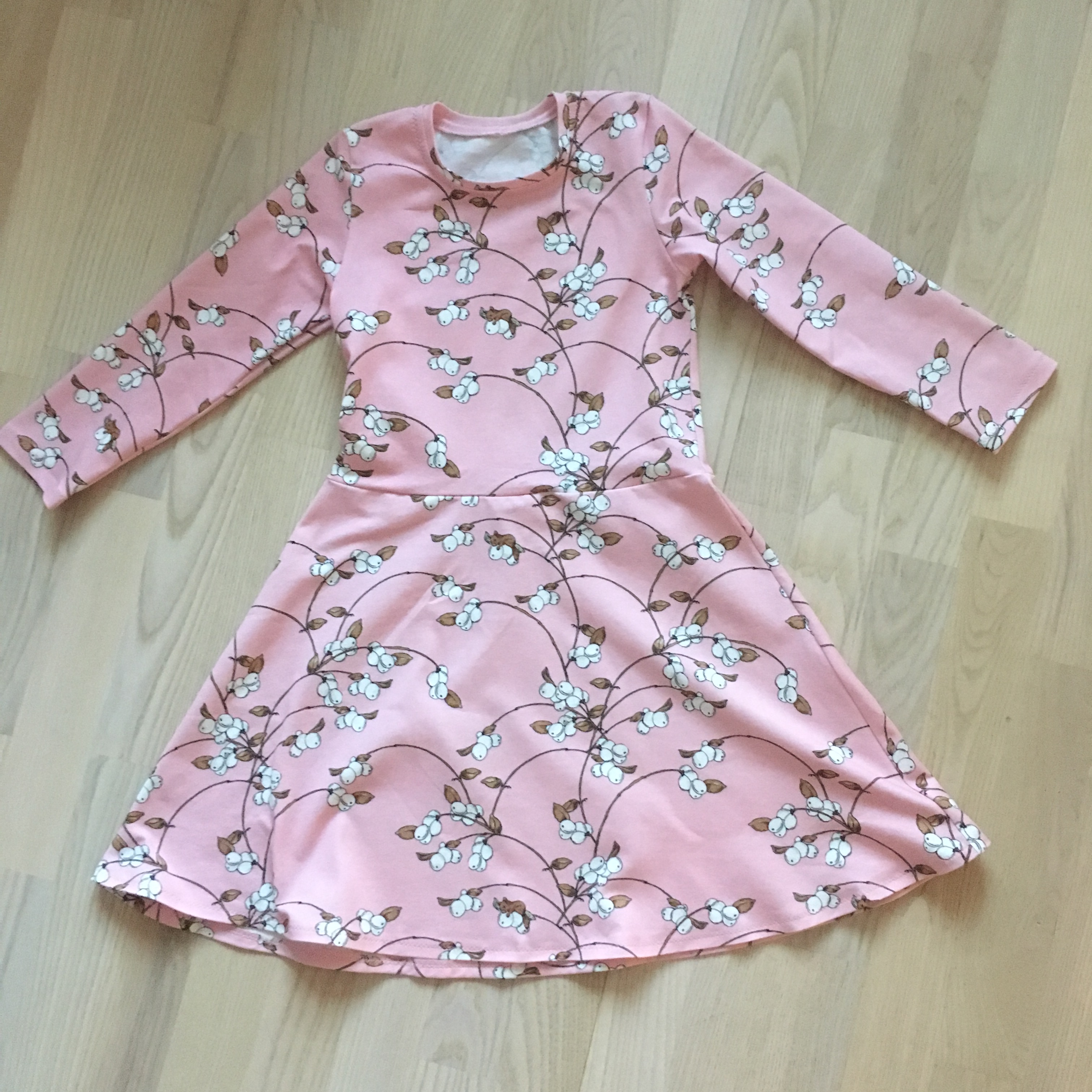 Another present for her was another pink item. This time a simple dress with long sleeves. This is the kind of dress she can well wear every day. This is based on the same Jujuna’s top pattern. I have just altered the length of the top so that it works better in a dress. And I have also lengthened the peplum pattern into skirt length. This lovely fabric is by Nuppu Pint Company. You might have noticed that this is the same pattern – but different color – that I used for my own Moneta dress earlier this autumn. I was happy to notice that the pink version didn’t have the same problems that the navy version of this fabric had.