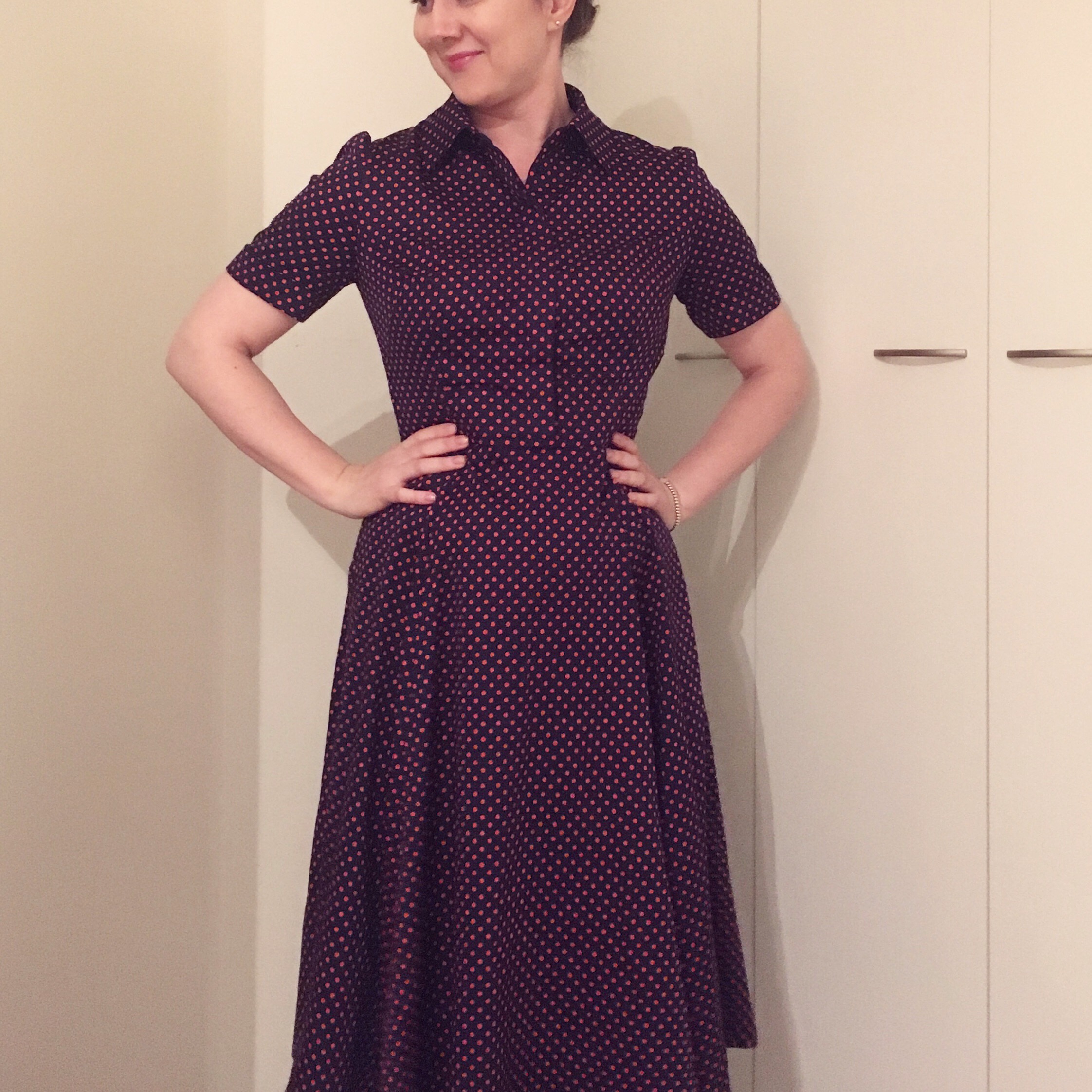 Viimeisimpänä, muttei vähäisimpänä, on vielä kaunis uusi mekkoni, joka on ilahduttanut syksyisiä työpäiviäni jo monta kertaa. Syksyllä ilmestyneestä Sew Over It:n uudesta e-kirjasta löytyi ihana Kate-mekon kaava. Koin tämän kaavan välittömästi omakseni. Rakastan paitamekkoja, ja tässä mekossa on kaikki yksityiskohdat kohdillaan. Kankaana käytin tässä melko ohutta puuvillaa. Mekossa on tyylikäs kaulus ja piilotettu nappilista. Itse päädyin laittamaan mekkoon nappien sijasta tummat nepparit. Jätin hameosasta halkiot pois, mutta muuten seurasin kaavan ohjeita tunnollisesti.
