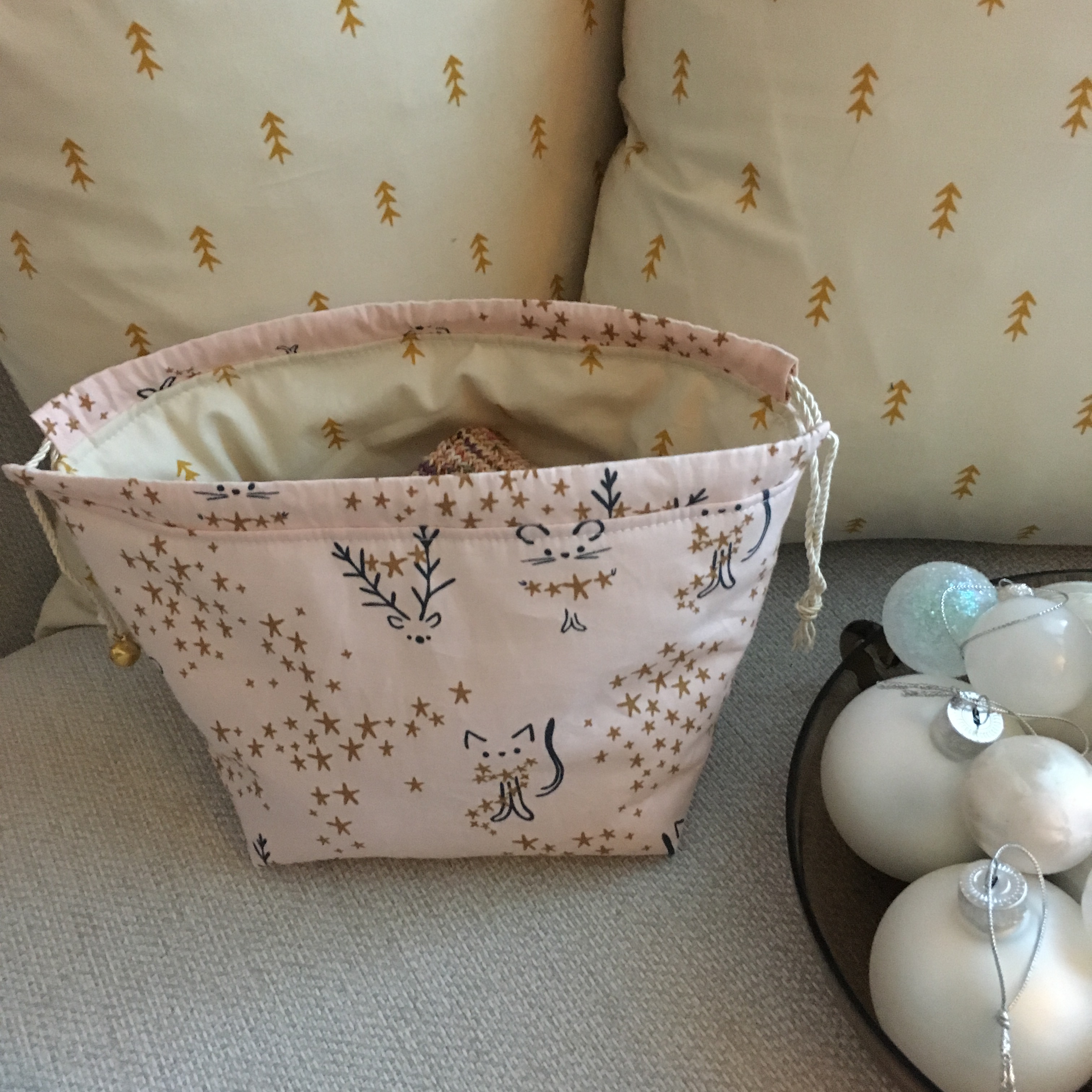 Tyynynpäällisten lisäksi halusin ommella neuleprojekteilleni pienen jouluilmeeseen sopivan projektipussukan. Nämä pienet pussukat ovat mitä mainioin käyttökohde söpöille kankaille, jotka eivät kuitenkaan suurissa määrässä sovi sisustukseen. Käytin pussukan vuoriksi tyynynpäällisistä ylijäänyttä kangasta, mikä saa nämä ompelukset sopimaan hyvin yhteen.