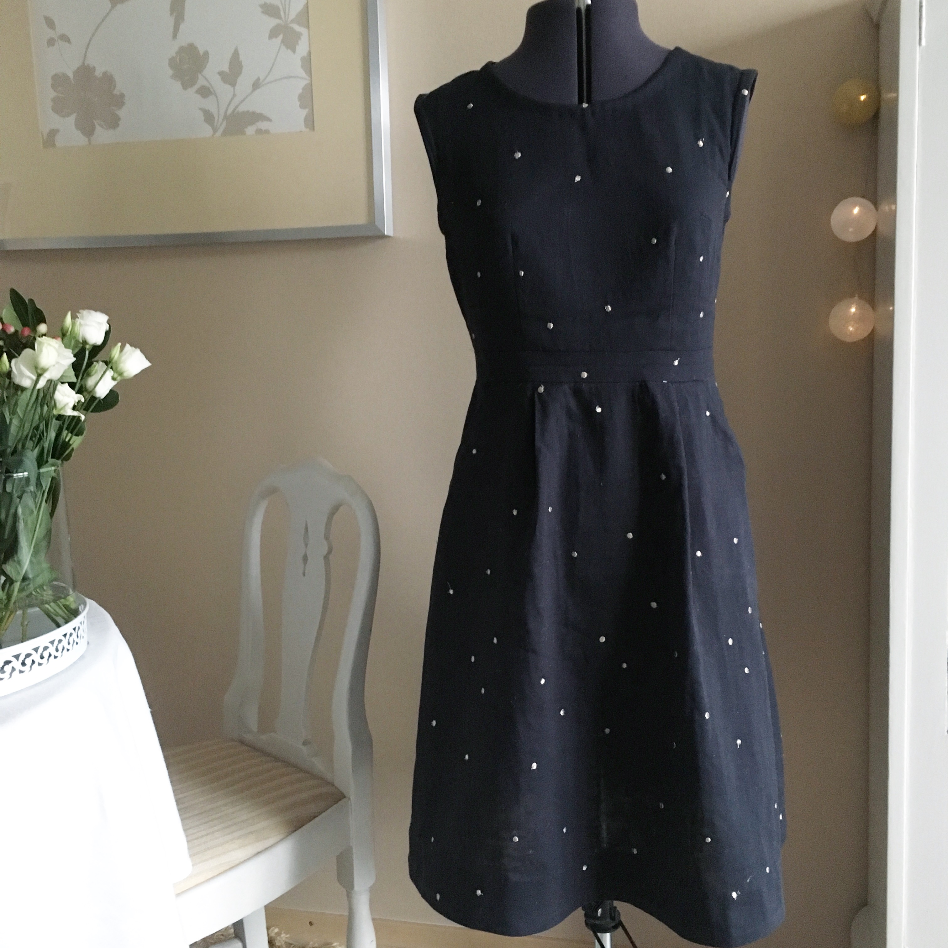 Kolmantena vaateompeluksena oli joulua ajatellen ompelemani Belladone-mekko. Tästä mekosta voi lukea enemmän Mekkojen vuosi -kirjoituksestani. Tämä oli todellinen hyvänmielen ompeluprojekti. Tykkään aina ommella mekkoja eikä tämä mekko ollut poikkeus. Harvinaisen kaunis ja hyvälaatuinen kangas teki ompelusta kuitenkin tavallistakin mieluisamman kokemuksen. On myös aina mukavaa kokeilla uusia mekkokaavoja – etenkin mikäli ne voi lopuksi todeta erinomaisiksi uusiksi luottokaavoiksi.