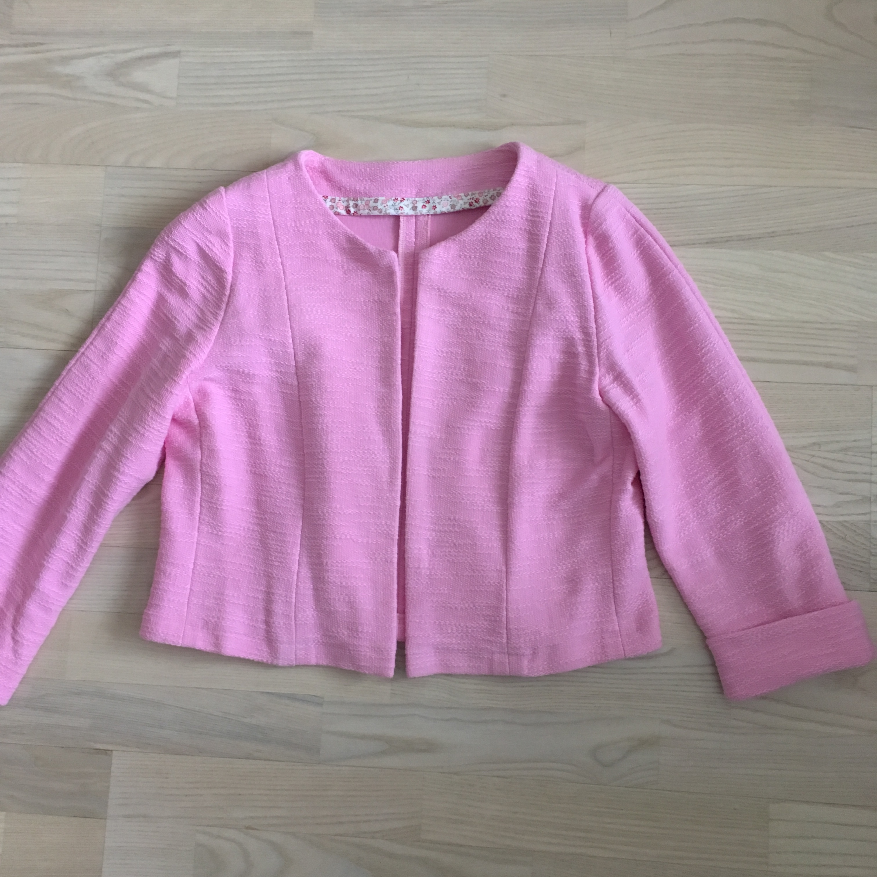 Coco on vuoritettu jakku, mutta itse päätin tehdä siitä viime vuonna myös vuorittoman version. Piirsin kaavaan alavarat ja ompelin kokonaisuuden pirteästä vaaleanpunaisesta puuvillasta. Viimeistelin alavarat kukallisella vinokaitaleella ja lisäsin hihoihin leveät käänteet. Tämä rennompi Coco on mainio kevät- ja kesäjakku silloin kun haluaa pukeutua hieman rennommin.