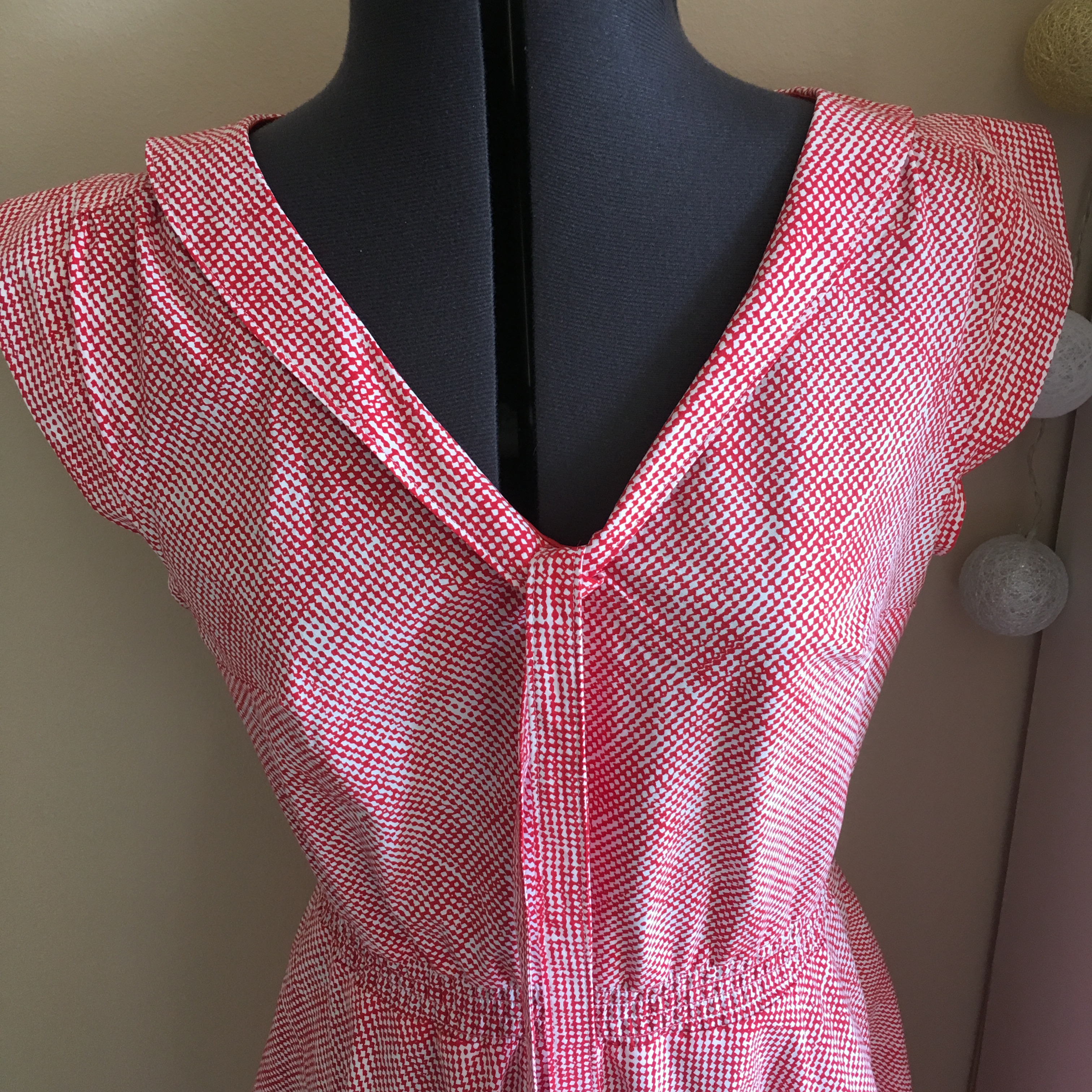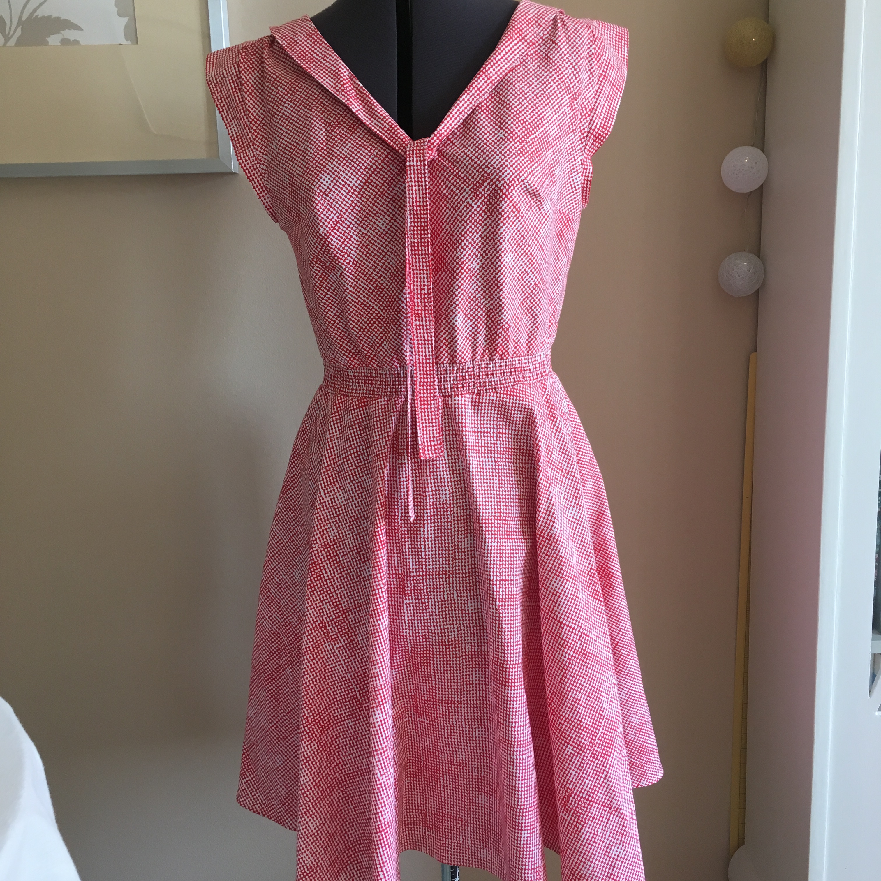 Ompelin tämän mekon puna-valkoisesta puuvillakankaasta. Kangas sopikin mekkoon hyvin.