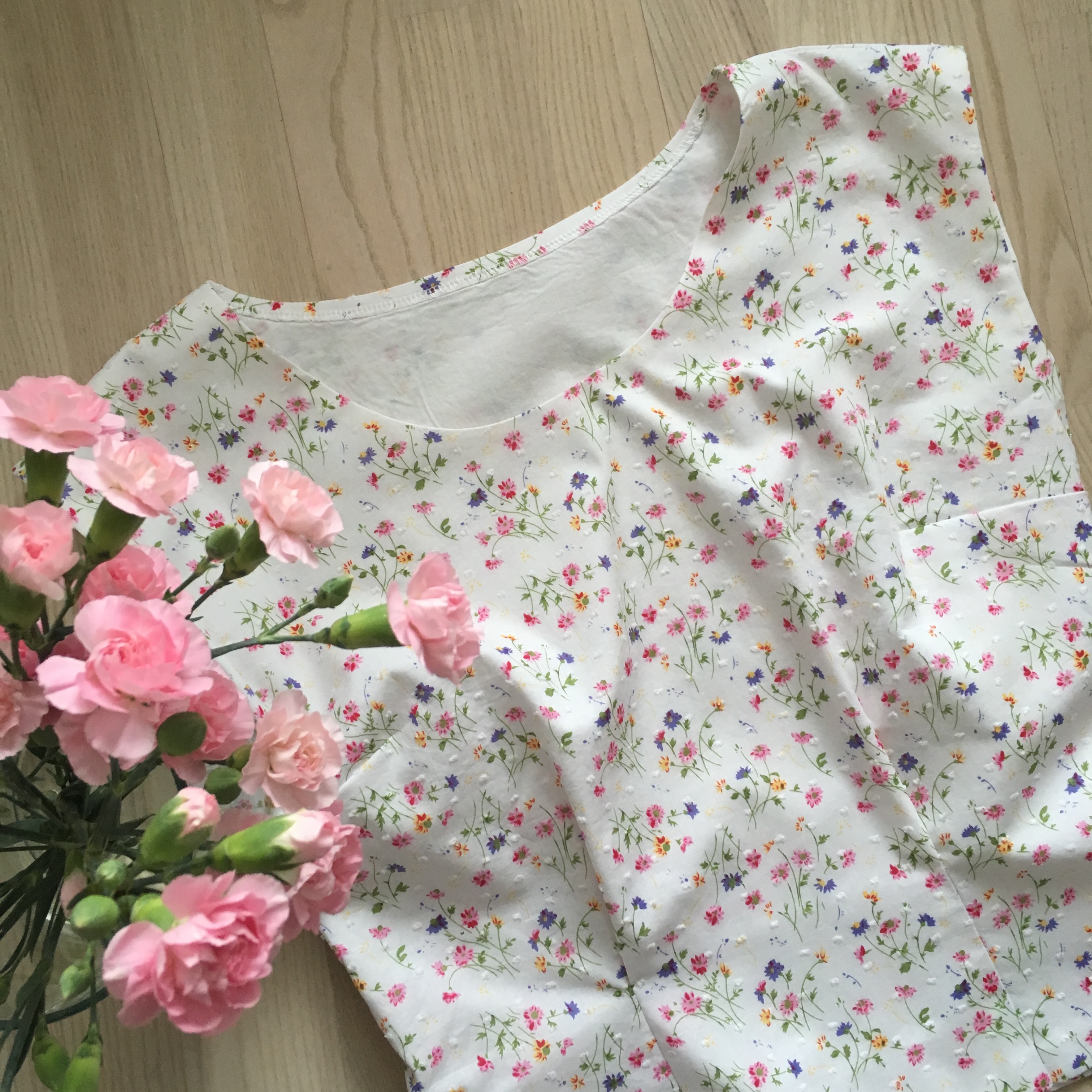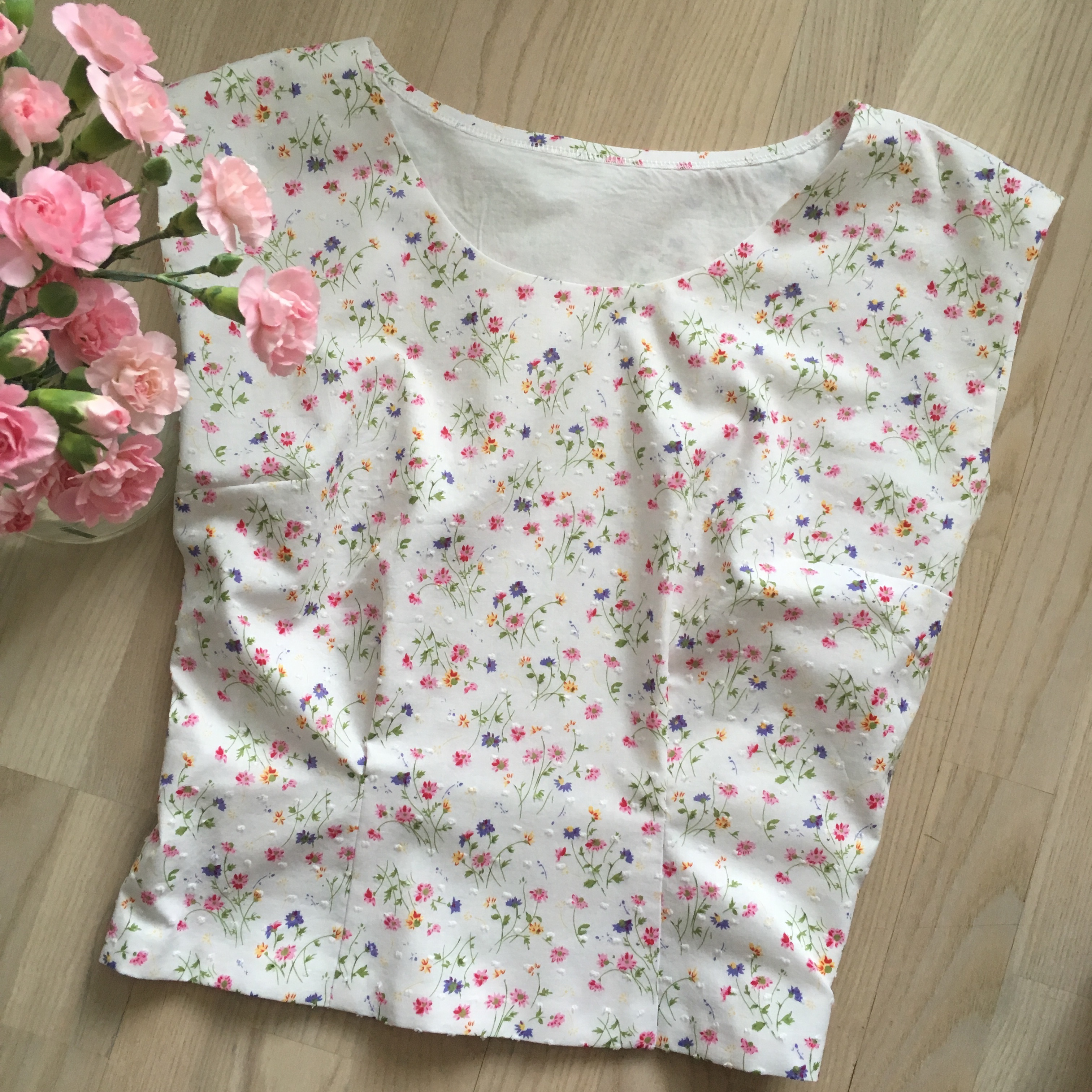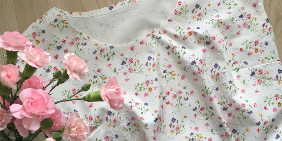 Ompelin puseron hyvin ohuesta puuvillakankaasta. Koska tämä ihanan kesäinen kukkakangas olisi yksinään ollut turhan läpinäkyvä, vuoritin sekä etu- että takakappaleen erikseen vielä valkoisella puuvillalla. Tämä tietenkin vie puserosta hieman sen keveyttä ja ilmavuutta. Toisaalta kaksinkertainen kangas tuo mukavasti ryhtiä. Vuorittamisen suurena etuna on myös käsinommeltujen viimeistelypistojen näkymättömyys. Sain ommeltua kaikki käänteet siten, että ommel kiinnittyy vain vuorikankaaseen. Tästä johtuen pääntie on kauniin sileä ilman minkäänlaisia pieniä piilopistoja.